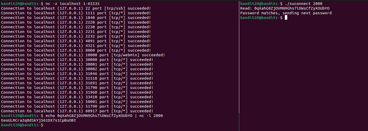 Then I check up which ports are free using netcat (the port range 1-65535 represents all available TCP/IP ports on a system) and set up a listener on port 2000 that serves the current password. Meanwhile in another pane, I connected the suconnect binary to this port. The program verified the password and responded with the next level password.